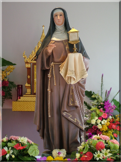 นักบุญคลารา ผู้ตั้งคณะคลาริส พรหมจารี วันที่ 11 สิงหาคม ค.ศ.1194 - 1253 คลารา เป็นธิดาของท่านเค้านท์ ได้ฟังคำเทศนาของนักบุญฟรังซิสในเมืองอัสซีซีจนเกิดความประทับใจ จึงเรียนต่อท่านว่าเธอปรารถนาจะถวายชีวิตแด่พระเป็นเจ้าจากนั้นทั้งคลาราและฟรังซิสจึงกลายเป็นเพื่อนสนิทกัน เมื่อคลาราอายุ 18 ปี ในวันอาทิตย์ใบลาน เธอได้รับใบลานจากมือพระสังฆราชแห่งอัสซีซี และในคืนนั้นเองเธอได้ออกจากปราสาทของตนพร้อมกับเพื่อนอีกคนหนึ่งตรงไปยังวัดที่ฟรังซิส และเพื่อนๆ ผู้ร่วมงานของท่านอยู่ คลาราได้เข้าพิธีปฏิญาณถวายตน ฟรังซิสเป็นประธานในพิธีตัดผมอันงดงามของเธอ และฝากเธอไว้กับภคินีคณะเบเนดิกตินในเมืองนั้น ภายหลังเธอได้ตั้งคณะนักบวชหญิงชื่อ “คณะคลาริส” ต่อมาพี่สาวและมารดาของเธอ ตลอดจนบรรดามิตรสหายตระกูลสูงศักดิ์ก็ได้สมัครบวชในอารามของเธอ วันหนึ่งเธอได้อัญเชิญศีลมหาสนิทไว้ที่ประตูอาราม ขณะที่ศัตรูของพระศาสนจักรเข้ามาจู่โจมอาราม เธอคุกเข่าสวดภาวนาขอความช่วยเหลือจากพระ จนศัตรูต้องหนีไป เธอป่วยอยู่ตลอดเวลา 28 ปี มีแต่สิ่งเดียวที่ช่วยเธอให้เธอเข้มแข็งอดทนได้ คือ ศีลมหาสนิท เธอถึงแก่กรรมในปี ค.ศ. 1253 นักบุญคลารา ได้ผ่านช่วงระยะเวลาครึ่งหลังของชีวิตของเธอส่วนใหญ่อยู่บนเตียงนอน เพราะเธอป่วยแต่ถึงกระนั้นเธอก็ได้พยายามที่จะไปร่วมทำวัตรพร้อมกับนักบวชคนอื่นๆ เธอได้ช่วยให้อารามของเธอรอดพ้นจากการโจมตีของพวกซาระเซ็นในปี ค.ศ. 1240 โดยเธอได้นำเอาศีลมหาสนิทออกมาแสดง เธอได้สิ้นใจที่ซานดามีอาโน นอกกำแพงเมืองอัสซีซี ในวันที่ 11 สิงหาคม ค.ศ. 1253 ขณะที่เธอมีอายุได้ 60 ปี