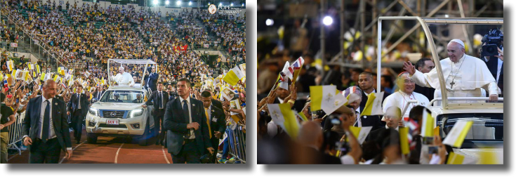 เวลา 18 นาฬิกา 30 นาทีโดยประมาณ สมเด็จพระสันตะปาปาฟรังซิส เสด็จโดยรถยนต์พระประเทียบจากพระที่นั่งอัมพรสถาน พระราชวังดุสิต ถึงยังสนามกีฬาแห่งชาติ แล้วเสด็จไปประทับรถพระประเทียบเปิดประทุน ประทานพระวโรกาสให้คริสตชนได้เฝ้าชมพระบารมีอย่างใกล้ชิด รถพระประเทียบเคลื่อนไปยังสนามเทพหัสดินเป็นแห่งแรก ซึ่งมีคริสตชนเฝ้ารอรับเสด็จและร่วมพิธีบูชาขอบพระคุณผ่านทางโทรทัศน์วงจรปิด แล้วจึงเคลื่อนไปยังสนามศุภชลาศัย เวียนรอบสนามเพื่อให้คริสตชนได้เฝ้าชมพระบารมีโดยทั่วกัน แล้วเสด็จไปยังที่รับรองเพื่อเปลี่ยนฉลองพระองค์สำหรับพิธีกรรม