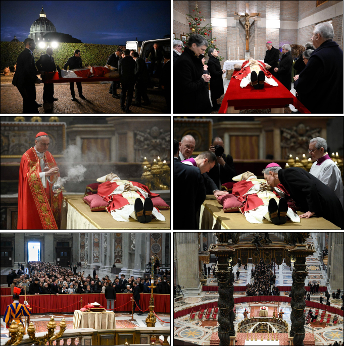 เช้าตรู่วันจันทร์ที่ 2 มกราคม ค.ศ. 2023 เคลื่อนศพของพระสันตะปาปากิตติคุณเบเนดิกต์ ที่ 16 จากวัดน้อยในอารามมารดาแห่งพระศาสนจักร มายังมหาวิหารนักบุญเปโตร วาติกัน เพื่อให้ประชาชนได้เข้ามาเคารพ