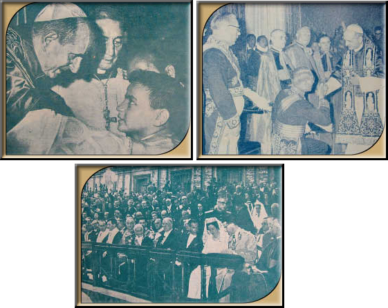 สมเด็จพระสันตะปาปาประทับคานหาม Sedia Gestatoria มาถึงที่กระทำพิธี เวลา18.00 น. ทรงถวายมิสซามโหฬาร เมื่อสวดที่เชิงพระแท่นและเสกพระแท่นแล้ว พระองค์เสด็จขึ้นประทับบนพระสมณอาสน์ รับคารวะจากบรรดาพระคาร์ดินัล, อัครสังฆราช, สังฆราช, อธิการฤษีและพระสงฆ์ประจำพระมหาวิหาร พิธีสวมไตรมงกุฎกระทำหลังมิสซาแล้ว โดยมีพระคาร์ดินัลอ๊อตตาเวียนี เป็นผู้สวม