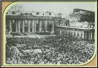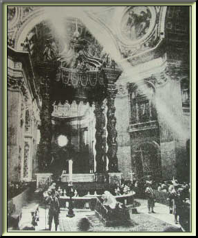 ภายในลานหน้าพระมหาวิหารนักบุญเปโตร ขณะนั้นเต็มไปด้วยผู้คนทุกชาติ ทุกภาษา เดินไปมาขวักไขว่คล้ายกับมีงานออกร้านณที่นั้น รถบัสคันใหญ่ นำนักทัศนาจรชาติต่างๆมาจอดอยู่รอบๆลาน พระสงฆ์ สามเณร และภคินีมีจำนวนนับไม่ถ้วนเดินปะปนอยู่กับฝูงชนนั้น ทุกคนหันหน้าไปทางเดียวกัน คือหันไปด้าน โบสถ์ซิกสตินเพื่อดูควันที่จะออกมาจากปล่องไฟที่โผล่ขึ้นมาจากที่นั้นนักถ่ายรูปสมัครเล่นพร้อมทั้งรูปอัดเสียงสำหรับอัดคำประกาศการ เลือกตั้ง ช่างหนังสือพิมพ์ ภาพหนังสือพิมพ์ นักข่าว วิทยุ โทรทัศน์ ยกทัพกันมาตั้งกล้องเรียงราย หันหน้าสู่โบสถ์ซิกสติน ดูคล้ายปืนบาซูก้าตั้งจังก้า เรียงเป็นแถว