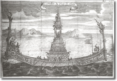 “ขบวนเรือของบรรดาขุนนางติดตามเรือพระที่นั่งเพื่อไปรับท่านราชทูตที่บ้านพัก เรือที่กล่าวนี้เป็นเหมือนบ้านเล็กๆ ซึ่งมีเป็นจำนวนมากมายที่ใช้ทั่วๆ ไปในประเทศนี้ เราต้องอาศัยเรือในการเดินทางไปยังที่ต่างๆ เพราะทั่วทั้งประเทศจะมีน้ำท่วมนาน 6 เดือน เพราะที่นี่เป็นที่ลุ่มและมีฝนตกอย่างต่อเนื่องในบางฤดู