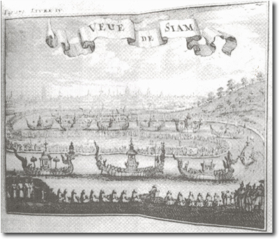 จำนวนเรือมากมายที่มาที่บ้านราชทูต มีไม่กี่ลำที่ไม่โอ่งโถง ขุนนางจำนวนหนึ่งขึ้นบกมาแสดงความเคารพท่านราชทูต เราลงเรือและทำตามหมายกำหนดการ พระราชสาส์นของพระเจ้าอยู่หัว (พระเจ้าหลุยส์ที่ 14) ถูกวางบนพระแท่นยกสูงในเรือลำหนึ่ง ท่านราชทูตลับเบเดอ ชัวซี และผู้ติดตาม ลงเรือพระที่นั่งและเรือของทางราชการ ขุนนางผู้ใหญ่ลงเรือของตน เมื่อขบวนเรือเริ่มเคลื่อน มีการตีกลอง สองข้างฝั่งแม่น้ำจนถึงที่ที่เจะไปขึ้นบก แน่นขนัดไปด้วยผู้คนที่ดูเหมือนไม่มีที่สุดสิ้น และเมื่อเรือพระราชสาส์นแล่นผ่านตรงหน้า พวกเขาก็หมอบกราบลง