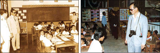 พระราชกรณียกิจในส่วนที่เกี่ยวกับการศึกษาในระบบโรงเรียนนั้น เริ่มจาก ใน พ.ศ. ๒๔๘๙ พระบาทสมเด็จพระเจ้าอยู่หัวทรงพระกรุณาโปรดเกล้าฯ ให้ตั้งโรงเรียนขึ้นสำหรับพระราชโอรสและพระราชธิดา บุตรข้าราชบริพาร ในพระราชวัง ตลอดจนเปิดโอกาสให้บุคคลทั่วไปได้ร่วมเรียนด้วย และเมื่อพระองค์ได้เสด็จพระราชดำเนิน เยี่ยมราษฎรและหน่วยปฏิบัติการทหาร ตำรวจ ตามบริเวณชายแดนทุรกันดารอยู่เนืองๆ ทำให้ทรงทราบถึงปัญหา การขาดแคลนที่เรียนของเด็กและเยาวชน อันเนื่องมาจากการให้บริการ ของรัฐไม่ทั่วถึง และมีปัญหาเรื่องการแตกแยกในอุดมการณ์ทางการเมือง ทำให้เยาวชนบางส่วนขาดโอกาสทางการศึกษา พระบาทสมเด็จพระเจ้าอยู่ หัวจึงมีพระราชดำริให้ทหารช่วยก่อสร้างโรงเรียน เพื่อให้ทหารมีส่วนช่วย เหลือประชาชนด้านการศึกษาตามโอกาสอันควรโดยให้แม่ทัพภาคเป็นแกน นำในการก่อสร้างโรงเรียนในเขตพื้นที่ที่รับผิดชอบ และพระราชทานพระราชทรัพย์ส่วนพระองค์ สนับสนุนการก่อสร้างโรงเรียน พระราชทานนามว่า “โรงเรียนร่มเกล้าฯ” นอกจากนั้นยังได้พระราชทานพระราชทรัพย์เพื่อร่วมสร้างโรงเรียนตำรวจตระเวนชายแดน สำหรับชาวไทยภูเขาที่อาศัยอยู่ในดินแดนทุรกันดารห่างไกลการคมนาคม ซึ่งมีชื่อเรียกว่า “โรงเรียนเจ้าพ่อหลวงอุปถัมภ์” อนึ่งพระองค์ ยังทรงเล็งเห็นถึงปัญหาของเยาวชนที่ครอบครัวประสบปัญหาเดือด ร้อนจากสาธารณภัย ภัยธรรมชาติ จึงทรงพระเมตตารับอุปถัมภ์ ให้กำลังใจแก่เยาวชนที่ขาดแคลนเหล่านี้ อันได้แก่ โรงเรียนราชประชานุเคราะห์และโรงเรียนสงเคราะห์เด็กยากจน