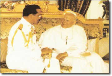 และเมื่อพระสันตปาปา จอห์น ปอล ที่ ๒ ประมุขแห่งคริสตจักรโรมันคาทอลิก เสด็จเยือนประเทศไทยอย่างเป็นทางการในฐานะพระราชอาคันตุกะ เมื่อวันที่ ๑๐ - ๑๑ พฤษภาคม พุทธศักราช ๒๕๒๗ ครั้งนั้นนับว่าเป็นกรณีพิเศษอย่างยิ่ง เพราะไม่เคยปรากฏมาก่อนว่าประมุขคริสตจักรโรมันคาทอลิกจะเสด็จมาเยือนประเทศไทยเช่นนี้ ได้เสด็จออกทรงรับ ณ พระที่นั่งจักรีมหาปราสาทอย่างสมพระเกียรติ สร้างความปลาบปลื้มอิ่มเอมใจแก่ชาวไทยที่นับถือคริสตศาสนาเป็นอันมาก