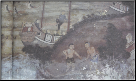 การใช้ขวานผึ่งถากท่อนไม้ให้เป็นโกลนเรือ ภาพวาดสมัยรัชกาลที่ ๖