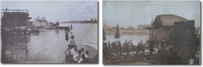 พวกที่ทอดทุ่นริ้วสายใน พวกปลัดกรมนั่งเรือคฤห์ ซึ่งใช้เรือรูปสัตว์เขียนลายน้ำมันไปทอดทุ่น ด้านขวา ๔ ทุ่น ด้านซ้าย ๔ ทุ่น ทางเหนือน้ำสุดเป็นเรือของขุนเทพราช ส่วนสุดท้ายสุดเป็นเรือของขุนศรีนรินทร์ ริ้วสายนอกให้พวกกองทำลุ กองเกณฑ์หัดฝรั่ง กองสนม และกองตำรวจ ทอดทุ่น ริ้วสายกลาง เป็นเรือพิณพาทย์ มีกลองแขกนำ มีเรือนอก ๒ ลำ เป็นเรือคอยจุดดอกไม้เพลิง ตรงกลางเป็นเรือบัลลังก์ขนานที่จะมาทรงลอยพระประทีป ด้านหน้าของเรือบัลลังก์ขนาน มีเรือตำรวจในทอดอยู่ ส่วนทางหน้าฉานเป็นเรือของกรมพระตำรวจใหญ่ กองกลางมีเรือดั้งของกรมอาสา และเรือกัน นอกจากนี้จะเห็นได้ว่าการทอดทุ่นยั่งมีเรือปืนที่เรียก “กันโบด” (Gun Boat) ๔ ลำ อยู่ด้านเหนือน้ำ ๒ ลำ ใต้น้ำอีก ๒ ลำ