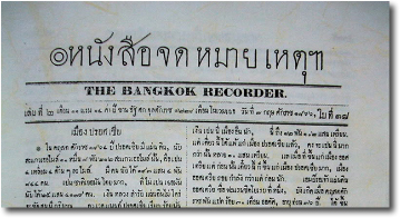 4 กรกฎาคม พ.ศ. 2387 "บางกอกรีคอร์เดอร์" (Bangkok Recorder) หรือ "หนังสือจดหมายเหตุ” เป็นหนังสือพิมพ์ฉบับแรกของไทย ฉบับปฐมฤกษ์เริ่มออกวางแผง หนังสือพิมพ์ฉบับนี้จัดพิมพ์โดย หมอบรัดเลย์ (Dr. Dan Beach Bradley, M.D.) มิชชันนารีอเมริกัน โดยใช้ตัวพิมพ์ที่เรียกว่า “บรัดเลย์เหลี่ยม” จัดพิมพ์ทั้งภาษาไทยและอังกฤษ ในระยะแรกเริ่มออกฉบับรายเดือน ต่อมาเปลี่ยนเป็นรายปักษ์หรือรายครึ่งเดือน แต่ออกได้เพียงสองปีก็ต้องเลิกกิจการ หนังสือพิมพ์บางกอกรีคอร์ดเดอร์ได้นำเอาวิธีการรายงานข่าวและการเขียนบทความแบบวิพากษ์วิจารณ์ ซึ่งเป็นของใหม่ในสมัยนั้นเข้ามาด้วย